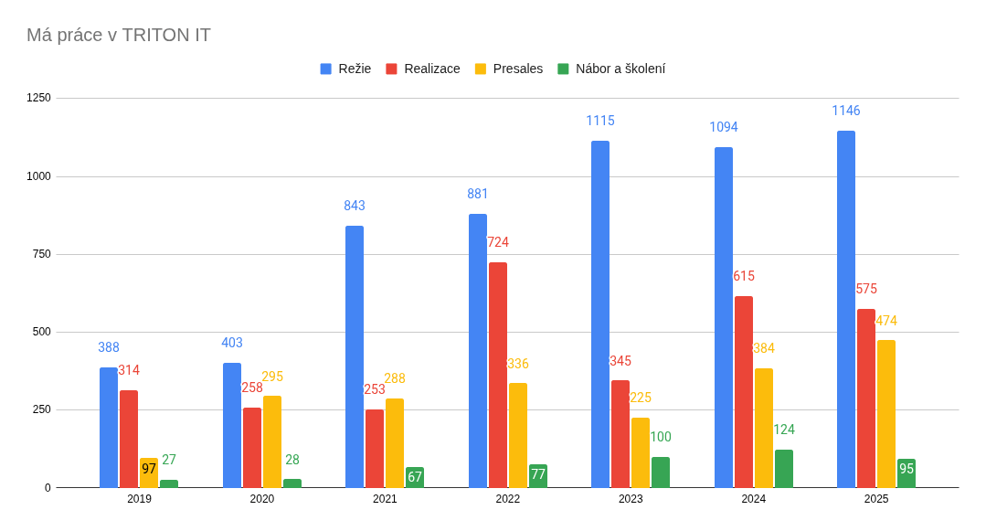 V roce 2025 jsem pokračoval v cestě započaté v roce 2023: „Publish or perish“... více se otevřít světu. Ukázat, co děláme, čím se zabýváme, aspoň zlomek, kousek po kousku. Nejen můj blog, ale také více obsahu na našem webu, na sítích, účast na odborných akcích. Podařilo se mi na toto vybudovat proces a zde musím hodně poděkovat kolegovi Davidovi, o kterého se mohu opřít. Web TRITON IT je plný neustále přibývajícího obsahu: případovek, zkušeností i odborných článků, a Czech Tech Talks je samostatná kapitola. Na počátku roku 2025 jsme rozebrali naši cílovku, udělali další refresh webu a nechali si poradit i s jeho emočním designem. Výsledek? Začali nám přicházet noví klienti i přes web sami od sebe.