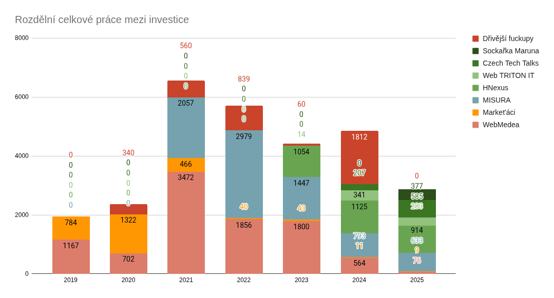 Obr. 3: V roce 2025 jsme zvolili konzervativnější přístup k investičním projektům. Soustředili jsme se spíše na podporu naší vlastní práce, náš vlastní obsah a side projekty než na tvorbu nových SaaS joint ventures. Jinak řečeno, po ukončení WebMedea a zklamání v RobJob jsme se v roce 2025 rozhodli držet více při zemi.